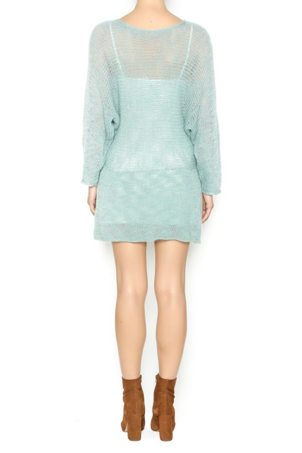 Mohair sweater dress is a side to side top with a shorter knit bottom. Worn over leggings and high boots is both stylish and comfy.