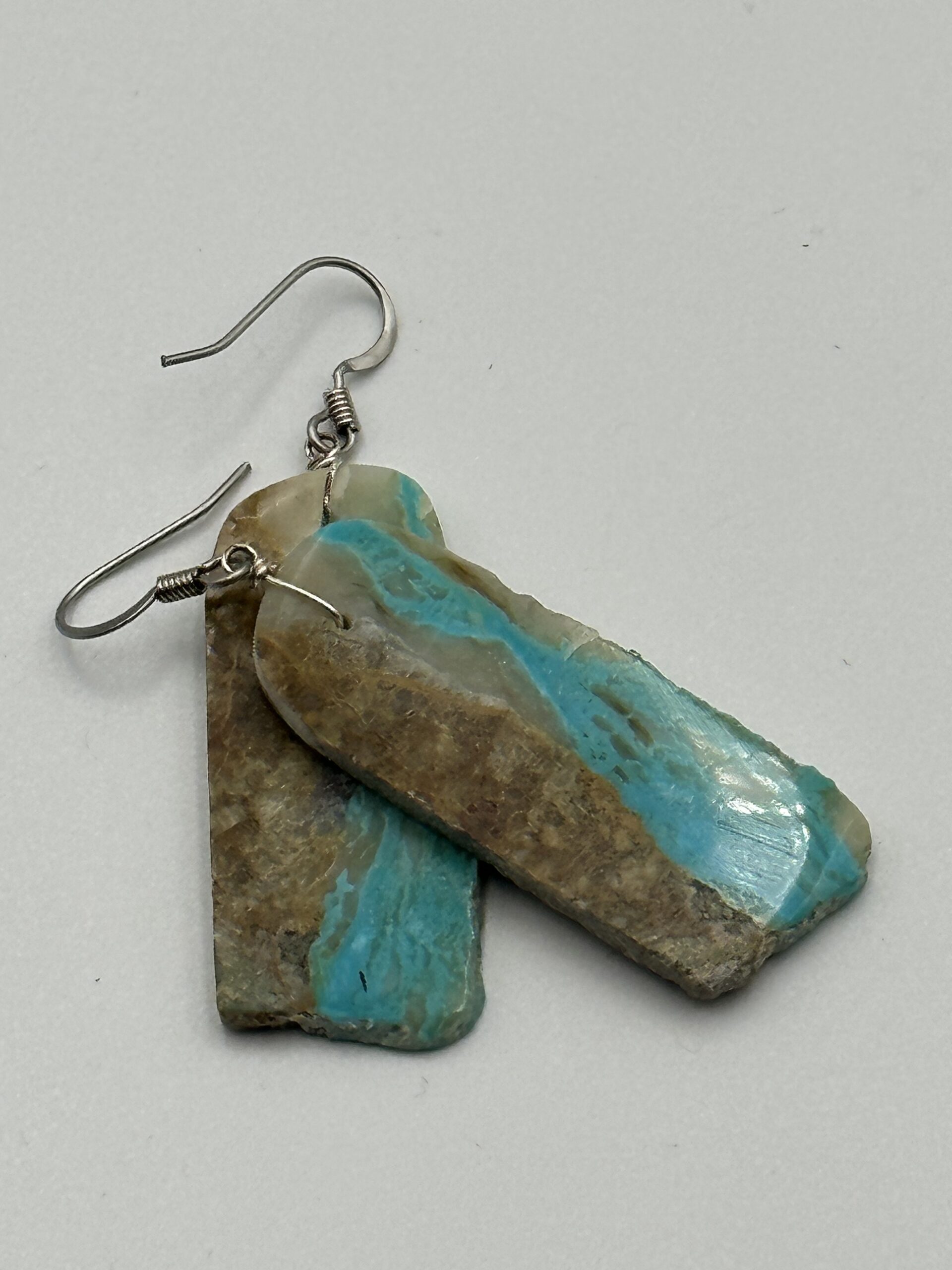 This is a beautiful pair of rough edged slab earrings medium size from the Boulder Mine in Nevada. Made on Santo Domingo Pueblo in New Mexico by Randy Garcia. These are 2 1/2″ long and 3/4″ wide. He didn’t polish the edges, so they are unique. Stunning.