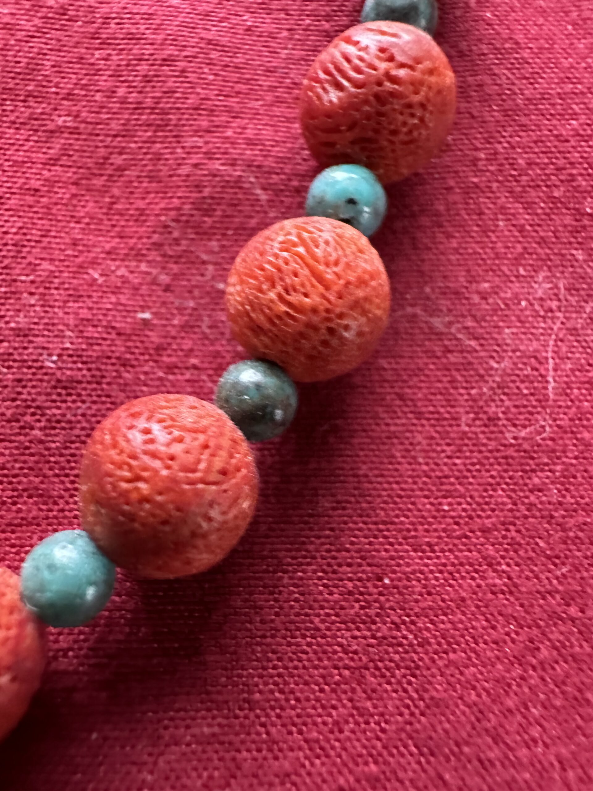 This strand of Mediterranean Coral and Kingman Turquoise necklace is beautiful. The coral is rough( not Polished ) was made on Santo Domingo Pueblo in New Mexico by Randy Garcia. It measures 23″ long. Men and women look great in this unique piece. If you would like more information, please contact me.