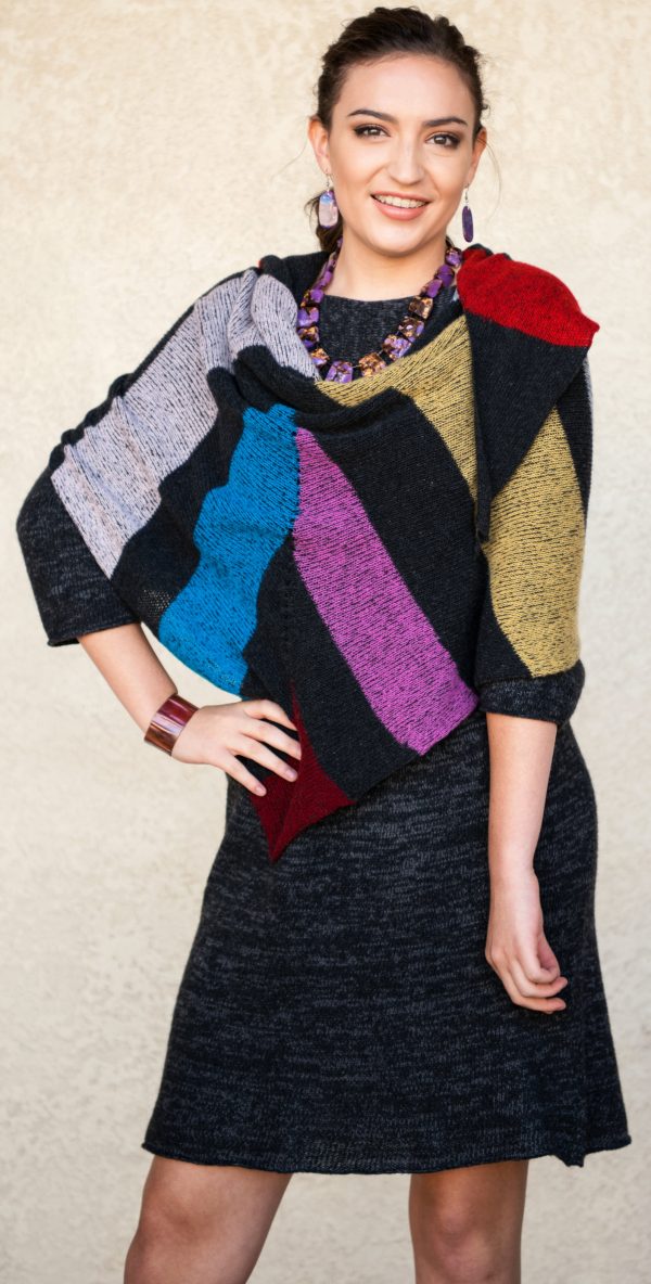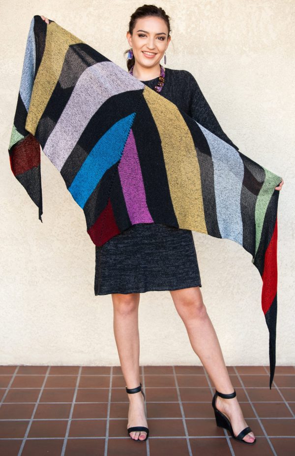 These are beautiful one-of-a-kind 100% cashmere triangular shawls. Since each one is different, I will send photos of what I have in stock. You can also pick between 3 to 9 colors you would like for special orders. If I have the color in stock, the price will not increase, but if I have to order it, the price increases based on how many colors I order. I knit these with a base color in back (purl) and changing colors in front. They measure 74″ across and 30″ long.
