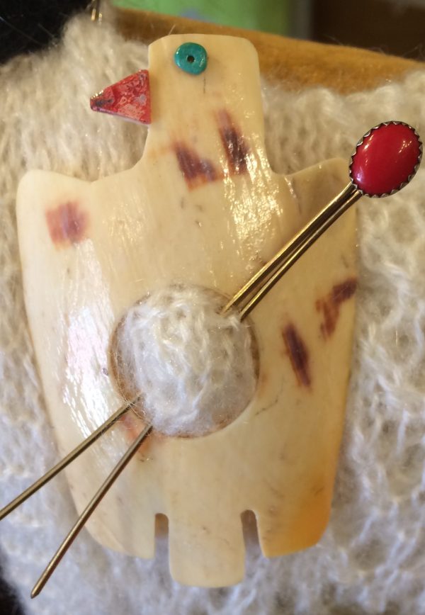 This is beautiful shawl pin hand-made by Randy Garcia from Santa Domingo Pueblo. These shawl pins are made out of melon shell, in all shapes. These pins are the only ones I use with my knitwear. Can also be used for hair. They are exclusive to my boutique. I designed them and give Randy free reign on what materials to use.They make great presents for that person who has everything. Main is melon inlaid with turquoise. Gallery has a thunderbird and roadrunner
