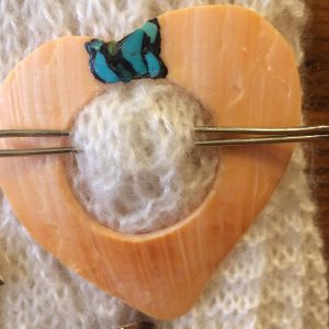 All natural Lion’s paw shawl pins. These are made on Santa Domingo Pueblo by Randy Garcia. These are perfect for any knitwear or weaving. Will not damage the fabric. These are all different sizes and colors I will send better photos if needed of what stock I have. These are pieces of shell and none are the whole shell. Main is variety of shapes and colors. They do come with sticks; one prong or two prongs. I can choose or send photos of what I have.